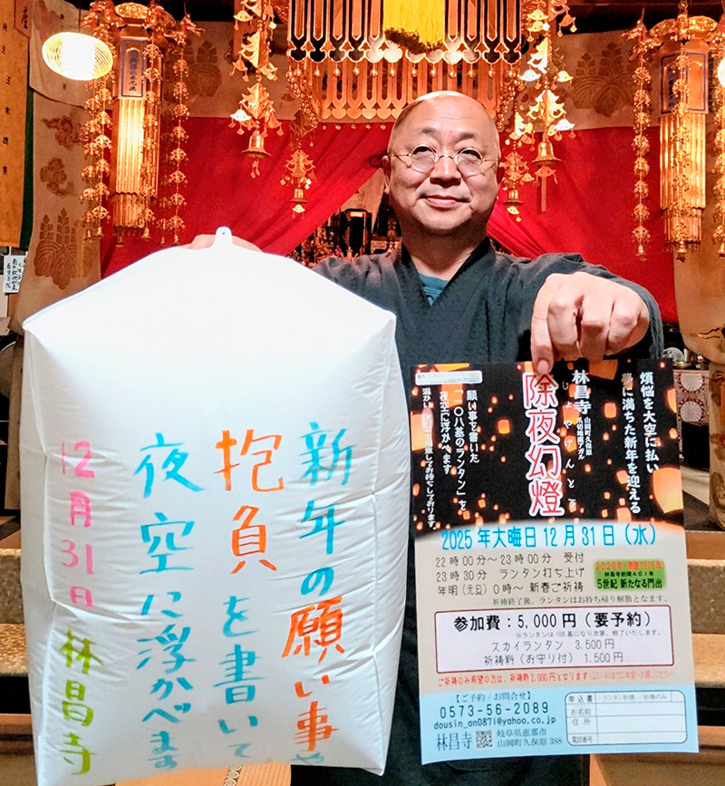 恵那市山岡町久保原の林昌寺で大晦日の12月31日(水)、願い事を書いたLED式ランタンを夜空に浮かべて新年を祝う「除夜幻燈(じょやげんとう)」が営まれます。