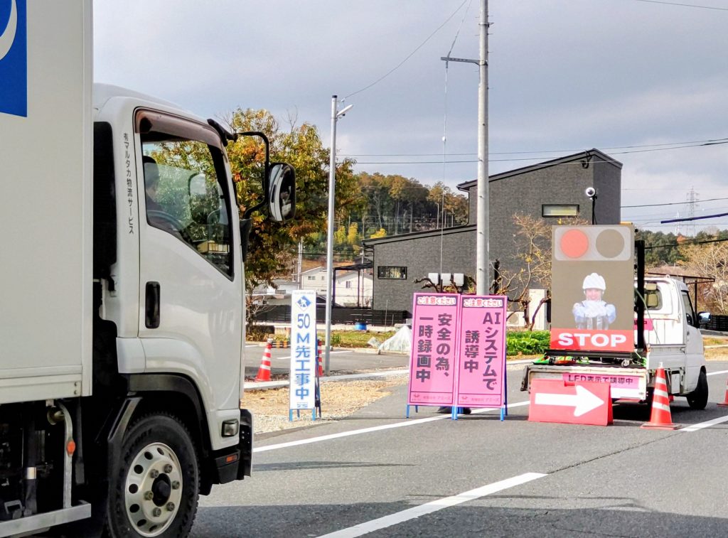 中津川市手賀野の「アミーズ」警備事業部が11月27日、「画像解析AIシステム(AI交通制御システム)」による交通誘導警備を同市茄子川地内で実施しました。