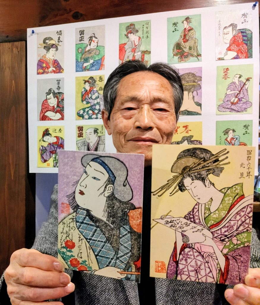 店内には、正月らしい華やかな役者絵や浮世絵約30点がずらり。「午前2、3時まで彫る日が1週間ほど続き、丸3日間かけて摺っていた当時を思い出します」と水野さん。「デジタルにはない、手仕事ならではの“温もり”を感じていただければ」と話しています。火・水・木・土曜、9―17時営業。℡0573(25)2442。