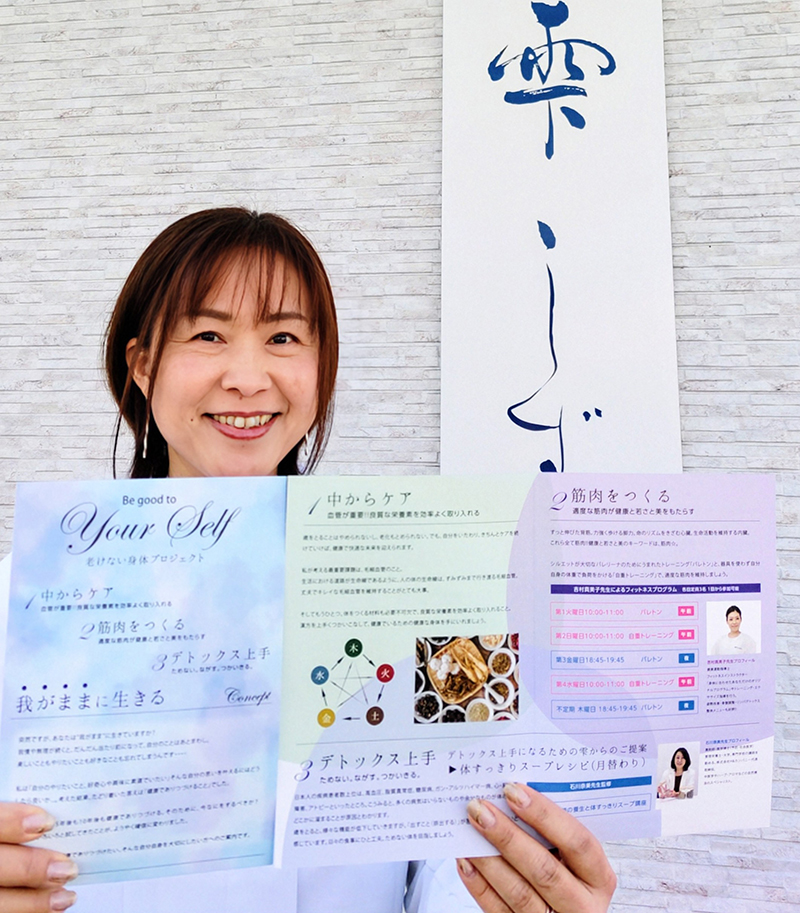 「中からケア」は新田さんが個別カウンセリングを行い、漢方の立場で支援。「筋肉をつくる」は健康運動指導士の吉村真美子さんが、姿勢と体幹を整える全身運動「バレトン」、自身の体重で負荷をかける「自重トレーニング」などを定員3人の少人数制で指導(1回4000円、単発参加可)。